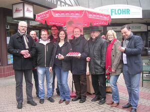 Neben aktuellen politischen Themen wie Verkehr, Schulentwicklung und Pflasterbelag wurde den Passanten ein „rotes Osterei“ der SPD Oberstenfeld als Ostergruß überreicht.